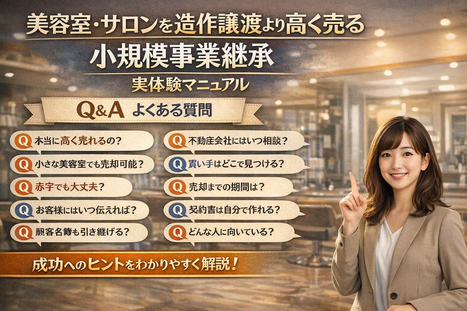 「閉店しかないのかもしれない」 「でも、できることなら少しでも良い形で終わりたい」 そう考えているサロンオーナー様に向けた、実践的な売却マニュアルです。